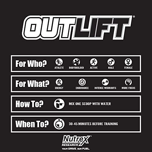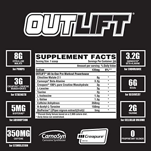 Met Outlift en zijn dosering heeft Nutrex een krachtige booster ontwikkeld. Het bevat 8000mg citrulline malaat, 3200mg beta alanine en 3000mg Creapure. Dit mengsel is bewust gecreëerd omdat de beta alanine ideaal is in combinatie met creatine en een eiwitrijk dieet. Bovendien bevat de pre-workout-booster de drie essentiële aminozuren leucine, isoleucine en valine in een verhouding van 2:1:1. Essentiële aminozuren kunnen niet door het lichaam zelf worden aangemaakt en moeten dus via voeding of supplementen worden ingenomen. Vooral tijdens de spieropbouw zijn aminozuren belangrijk voor het lichaam. Aangezien de booster 350mg watervrije cafeïne bevat, moeten andere cafeïnehoudende producten worden vermeden op dagen dat het supplement wordt ingenomen.