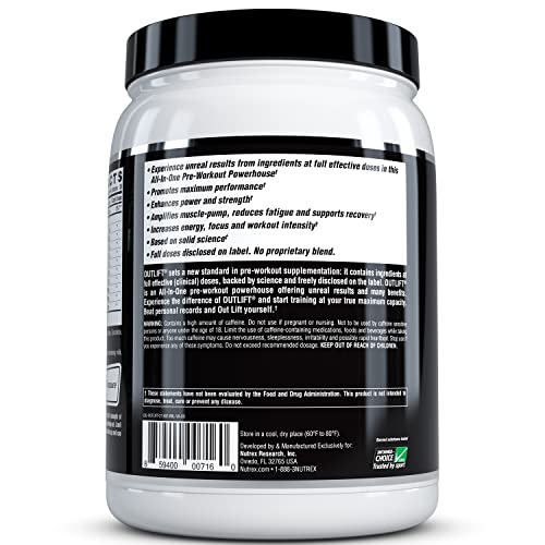 Met Outlift en zijn dosering heeft Nutrex een krachtige booster ontwikkeld. Het bevat 8000mg citrulline malaat, 3200mg beta alanine en 3000mg Creapure. Dit mengsel is bewust gecreëerd omdat de beta alanine ideaal is in combinatie met creatine en een eiwitrijk dieet. Bovendien bevat de pre-workout-booster de drie essentiële aminozuren leucine, isoleucine en valine in een verhouding van 2:1:1. Essentiële aminozuren kunnen niet door het lichaam zelf worden aangemaakt en moeten dus via voeding of supplementen worden ingenomen. Vooral tijdens de spieropbouw zijn aminozuren belangrijk voor het lichaam. Aangezien de booster 350mg watervrije cafeïne bevat, moeten andere cafeïnehoudende producten worden vermeden op dagen dat het supplement wordt ingenomen.
