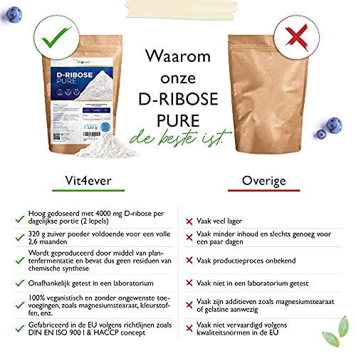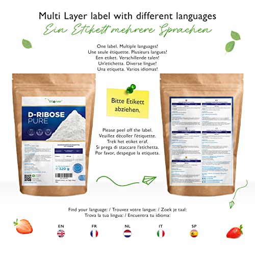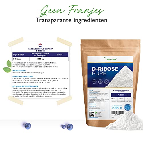 Specification: D-Ribose Poeder – 320 g – 80 dagelijkse porties met 4 g (2,6 maanden voorraad) – Natuurlijk uit fermentatie – Puur…