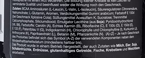 BCAA aminozuren (30% L-leucine, 15% L-valine, 15% L-isoleucin), zuurteregelaars – citroenzuur, natriumcitraat, appelzuur; 10% L-glutamine, aroma’s, verdikkingsmiddelen – arabicum, zoetstoffen – acesulfaam K, sucralose; scheidingsmiddel. Calciumfosfaat, siliciumdioxide; emulgator – sojalecithine, 0,02% vit. B6 (pyridoxinehydrochloride), kleurstoffen: riboflavine (voor citroensmaak, perensmaak), riboflavine, beta-caroteen (voor sinaasappelsmaak), echt karmijn (bij smaak: fruitpunch, aardbeien). Opmerking: met kleurstof en zoetstoffen. Het product mag tijdens de zwangerschap en tijdens de borstvoeding niet worden ingenomen. De vorming van kleine kristallen is geen teken van verminderde kwaliteit en heeft geen invloed op het effect of de smaak.
