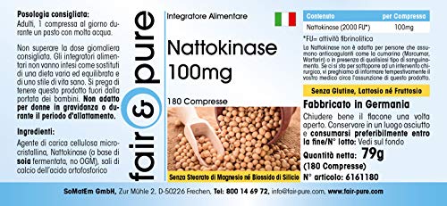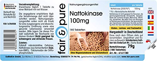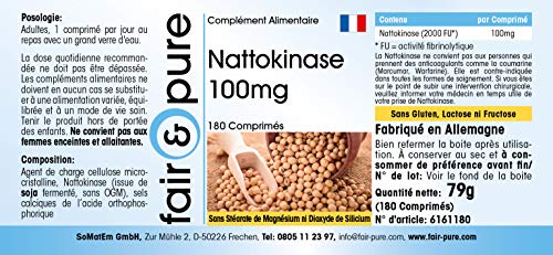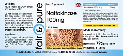 Voor uw gezondheid: Nattokinase 100mg, 2000 FU, 180 tabletten – Het product is glutenvrij, fructosevrij en lactosevrij en vrij van magnesiumstearaat, siliciumdioxide, kleur- en smaakstoffen en conserveringsmiddelen.