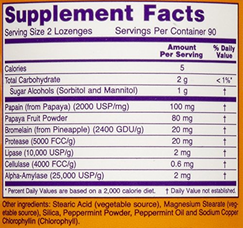 Papaïne (vanaf papaya) (2000 USP/mg)100 mg´ Papaya Fruit Powder80 mg´ Bromelain (van Pineapple) (2400 GDU/g)20 mg protease (5000 FCC/g)20 mg——– lipase (10,000 USP/g)2 mg. Cellulase (4000 FCC/g)0,6 mg. Alpha-amylase (25.000 USP/g)2 m. Stearic zuur (groeibare bron), magnesium stearaat (groenten), silica, pepermunt leaf. powder, peppermint olie and sodium copper chlorofyl (chlorofyl) .g