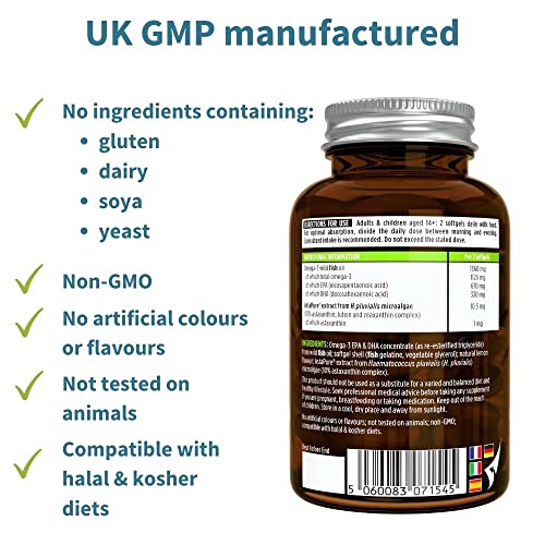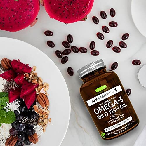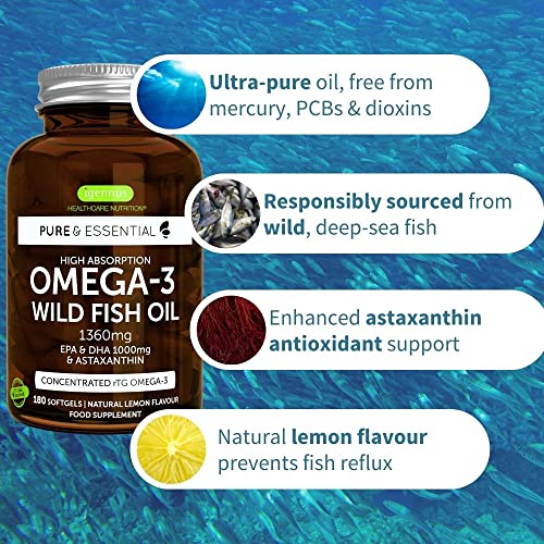 Specification: Pure & Essential Hoge Absorptie Omega-3 Wilde Visolie 1360 mg, EPA DHA 1000 mg & Astaxanthine 1 mg, citroensmaak, 180…