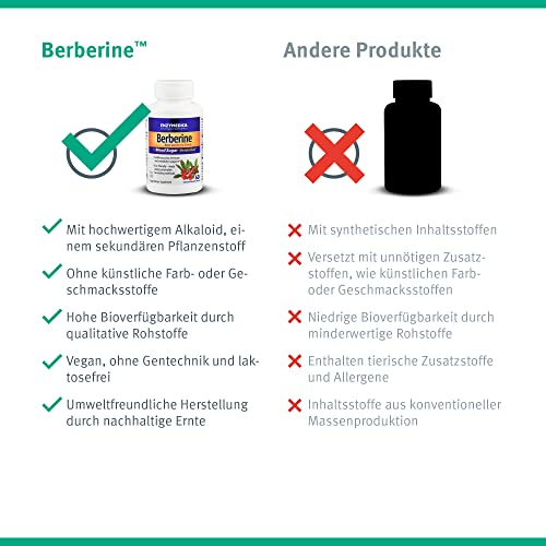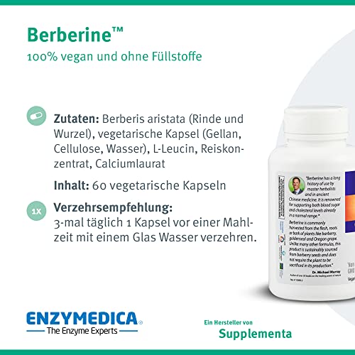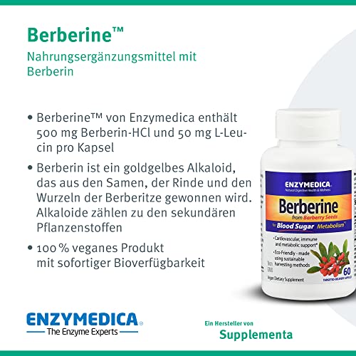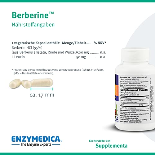 Berberin van enzymedica bevat 500 mg berberberin-HCL en 50 mg L-leucine per capsule. Berberin is een goudgele alkaloïde dat wordt gewonnen uit de zaden, schors en de wortels van de berbertz. Alkaloïden behoren tot de secundaire plantaardige stoffen. De Berberinzaden voor dit product worden uit duurzame bronnen geoogst.
