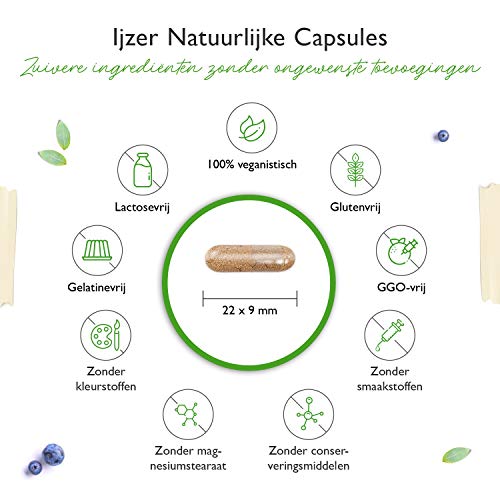 VEGAN & ZONDER TOEPASSINGEN: Onze ijzeren capsules zijn 100% veganistisch en vrij van magnesiumstearaat, gelatine, aroma’s, kleurstoffen, stabilisatoren, conserveermiddelen, natuurlijk lactosevrij en glutenvrij en zonder genetisch gemanipuleerde ingrediënten (GGO-vrij).