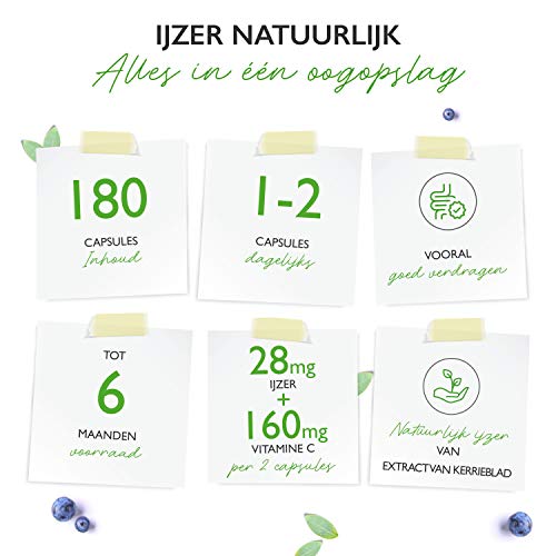 Natuurlijk ijzer + vitamine C uit kerrieblad extract & rozenbottelextract – 180 capsules (4 maanden levering) – 28 mg…