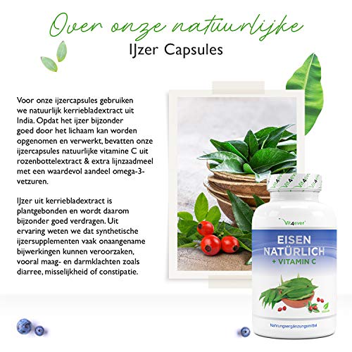 NATUURLIJKE INGREDIËNTEN: In tegenstelling tot conventionele ijzerbereidingen zoals ijzertabletten, halen wij onze werkzame stoffen uitsluitend uit natuurlijke bronnen en bevatten onze capsules zuiver plantaardig ijzer of vitamine C dankzij curryblad-extract & rozenbottelextract.