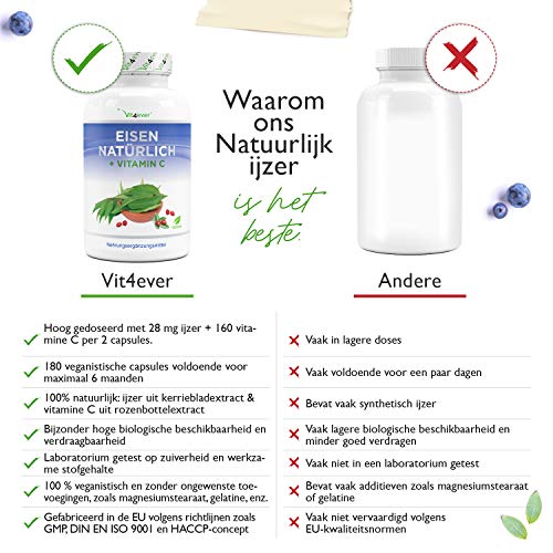 Specification: Natuurlijk ijzer + vitamine C uit kerrieblad extract & rozenbottelextract – 180 capsules (4 maanden levering) – 28 mg…
