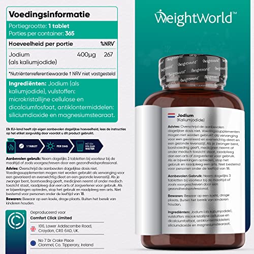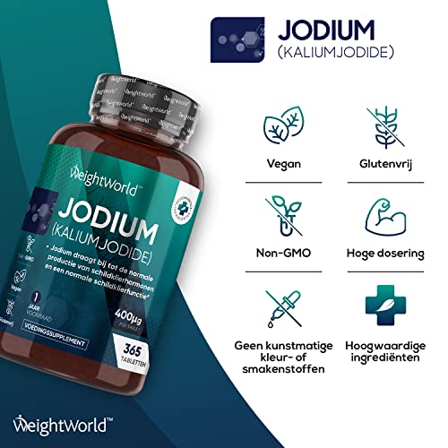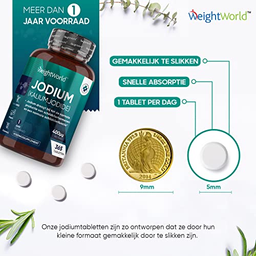 Jodium tabletten – 400 mcg – 365 vegan tabletten voor een jaar – Jodiumjodide tabletten – 1 per dag – Geteste ingrediënten – van WeightWorld Hoge kwaliteit jodium uit zee-algen – Onze jodiumtabletten bevatten hoge kwaliteit jodiumjodide. Deze tabletten zijn met 8mm klein en gemakkelijk door te slikken.365 tabletten voor 1 jaar – Met 365 jodium pillen per verpakking bevat dit supplement 1 jaar voorraad.Schildklier en geheugen – Jodium is essentieel voor de productie van schildklierhormonen en helpt energie vrij te maken uit de voeding. Daarnaast draagt jodium bij tot de normale werking van zenuwen en draagt het bij aan een normaal geheugen. Claims geautoriseerd door EFSA, de Europese Autoriteit voor Voedselveiligheid.