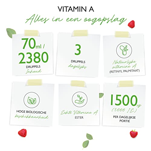 UITSTEKENDE PRESTATIES: Hoog gedoseerd met 1500 µg vitamine A per 3 druppels. Langdurige levering met 2380 druppels per flesje (70 ml). De pipet van natuurlijk rubber van hoge kwaliteit maakt een gemakkelijke en nauwkeurige dosering mogelijk.