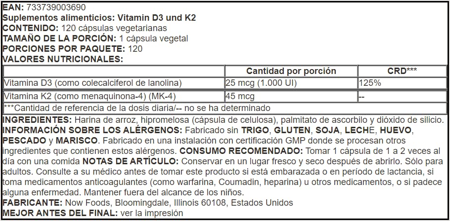 Specification: Now Vitamine D3 1000IE & Vitamine K2, 120 Stuk, 120 Capsules