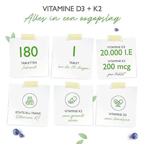 Vitamine D3 20.000 I.U. + Vitamine K2 200 mcg Menaquinone MK7 Depot – 180 tabletten – 99.7+% All-Trans – Vegetarisch…