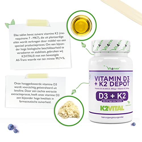 Specification: Vitamine D3 20.000 I.U. + Vitamine K2 200 mcg Menaquinone MK7 Depot – 180 tabletten – 99.7+% All-Trans – Vegetarisch…