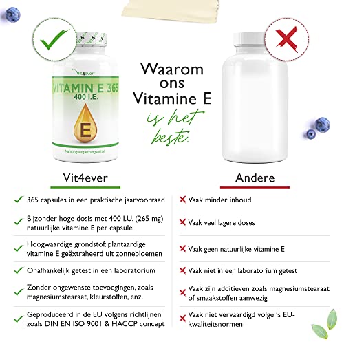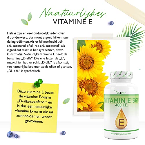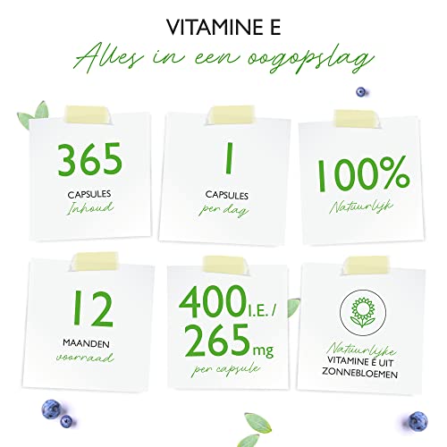 UITSTEKENDE PRIJSVOORDEEL: 365 hooggedoseerde capsules in een praktische 12-maanden voorraad (jaarverpakking). Elke softgel-capsule bevat 400 I.E. / IU (268 mg) natuurlijke vitamine E.